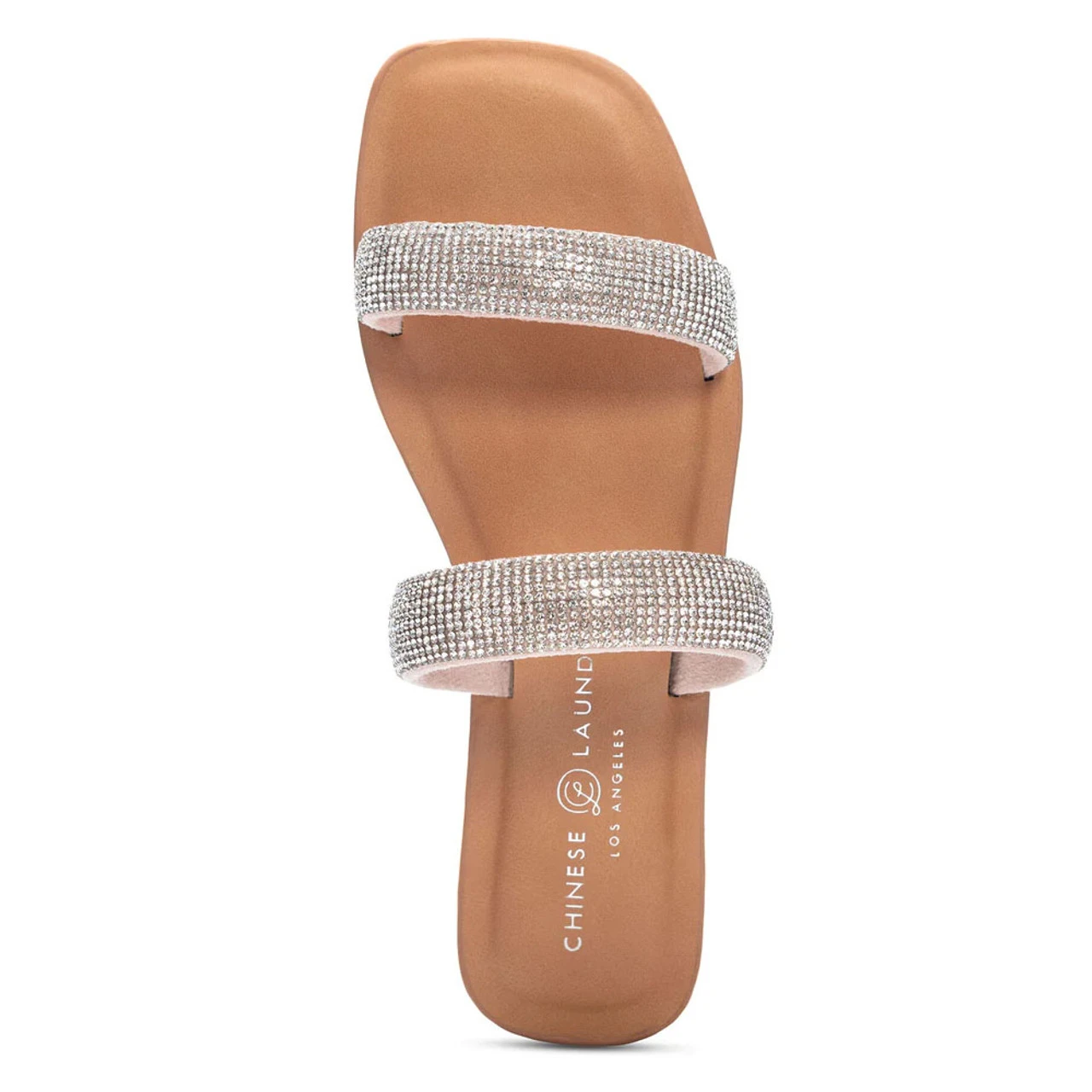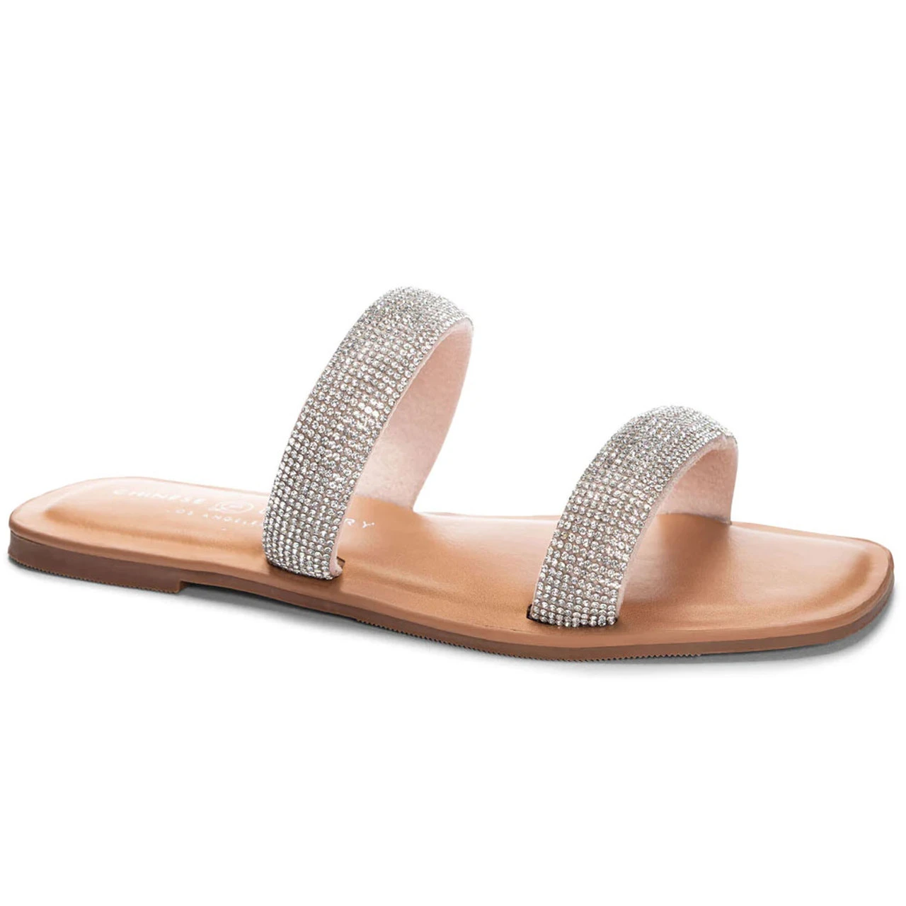 An easy sandal to slip on for the beach or for girls night out, it features puffed straps with rhinestones that give it a little shine.